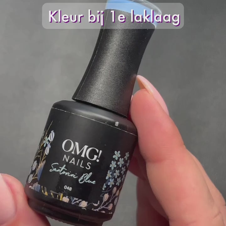“Santorini Blue" OMG! gellak, een levendige tint geïnspireerd door de adembenemende vergezichten en kalme wateren van de Zee. Deze verfijnde blauwe kleur doet je denken aan zonovergoten terrassen en pittoreske straatjes. Met "Santorini Blue" creëer je een tijdloze en verfijnde look, perfect voor elke gelegenheid.